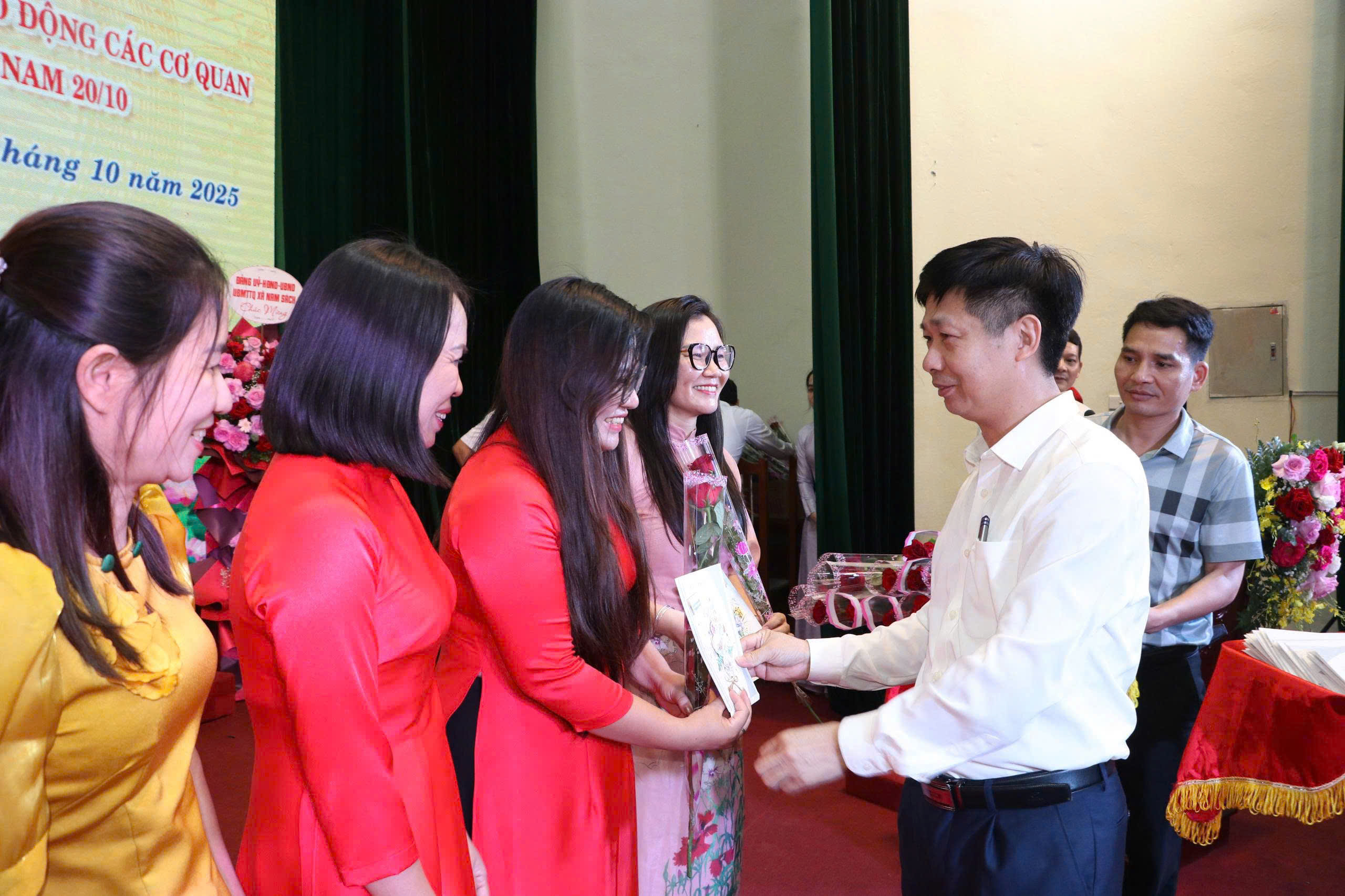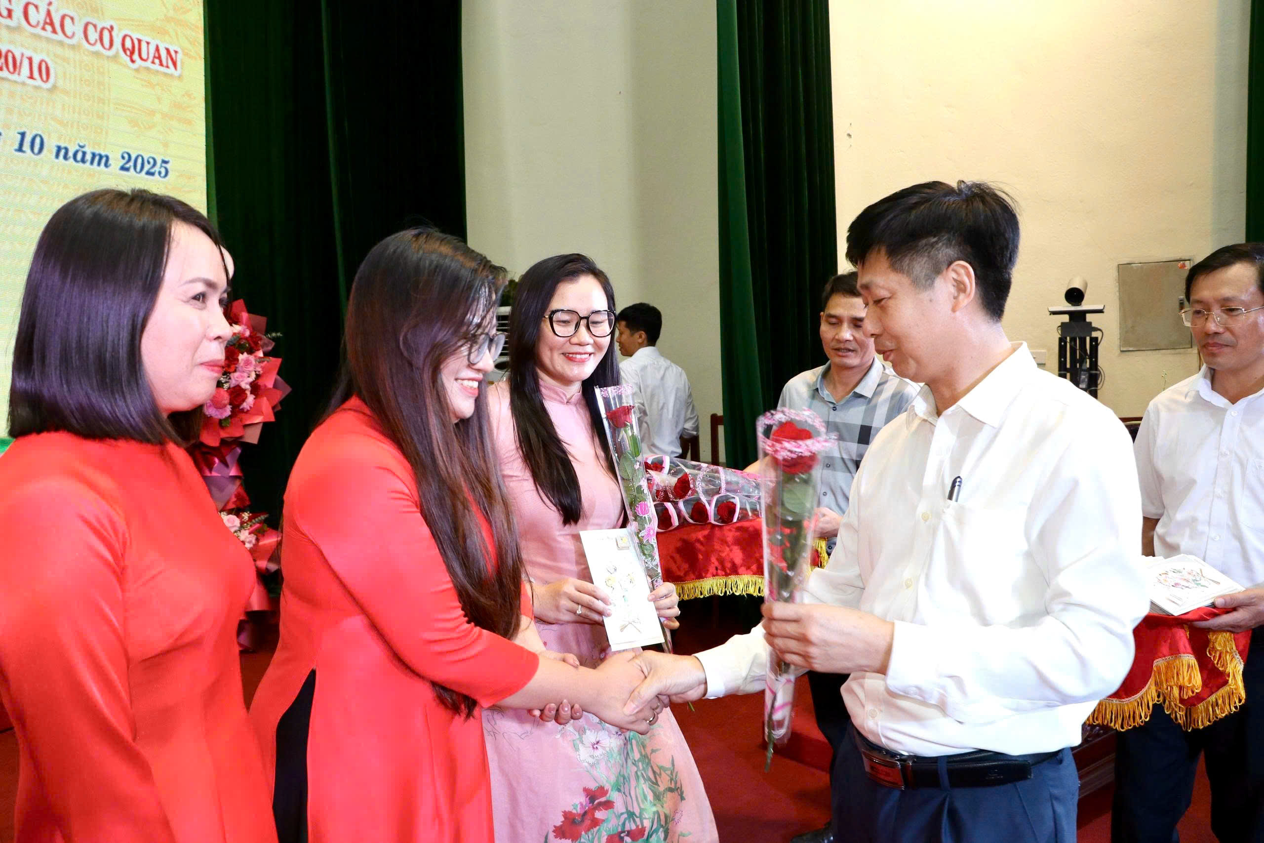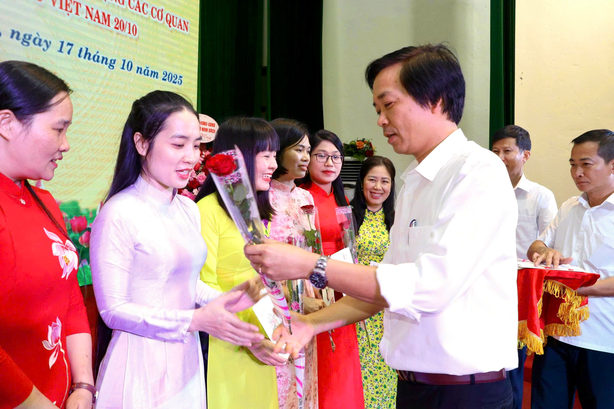 Đồng chí Phùng Văn Diện – Phó Bí thư, Chủ tịch UBND xã tặng hoa chúc mừng nữ cán bộ cơ quan Đảng, chính quyền xã nhân dịp 20/10
