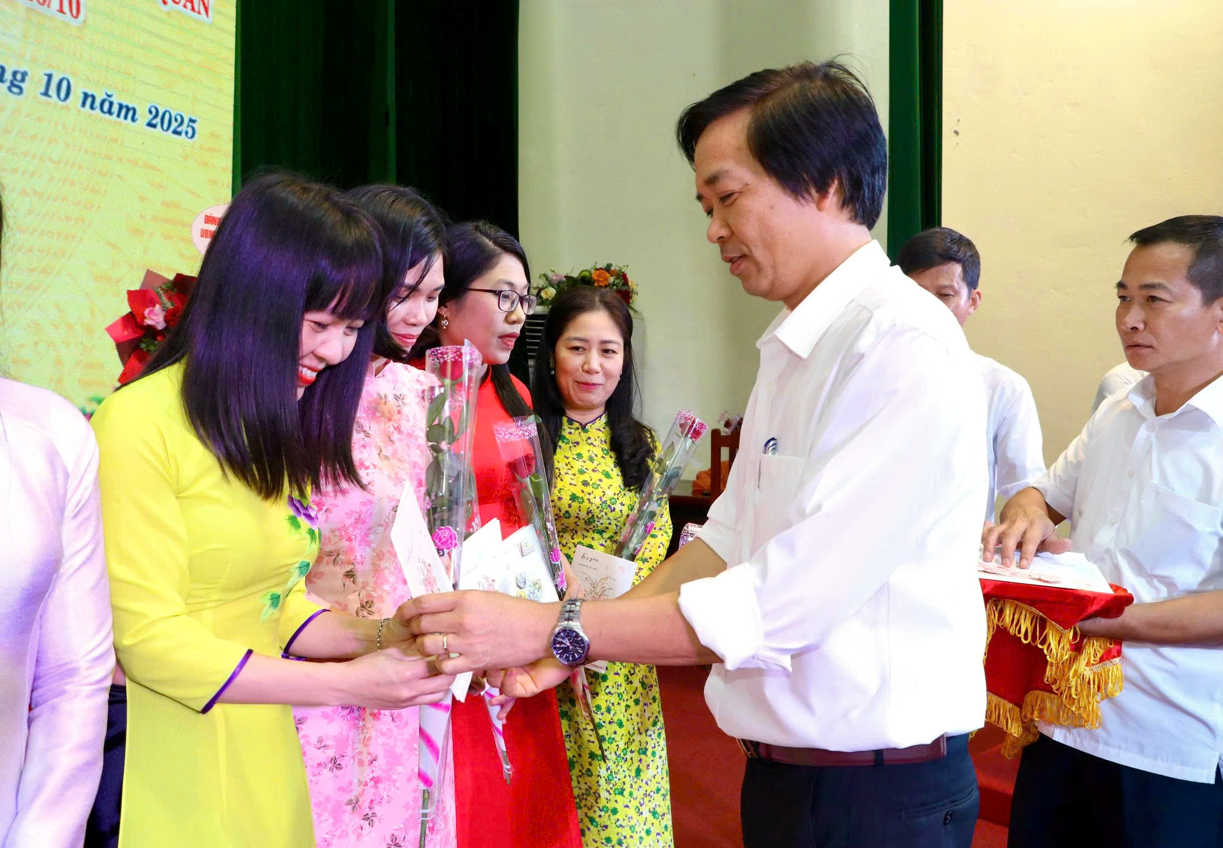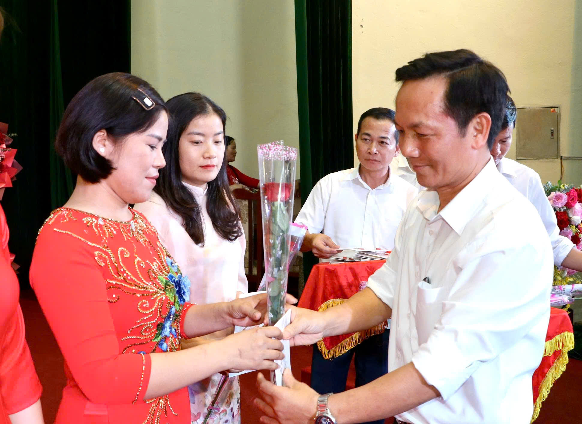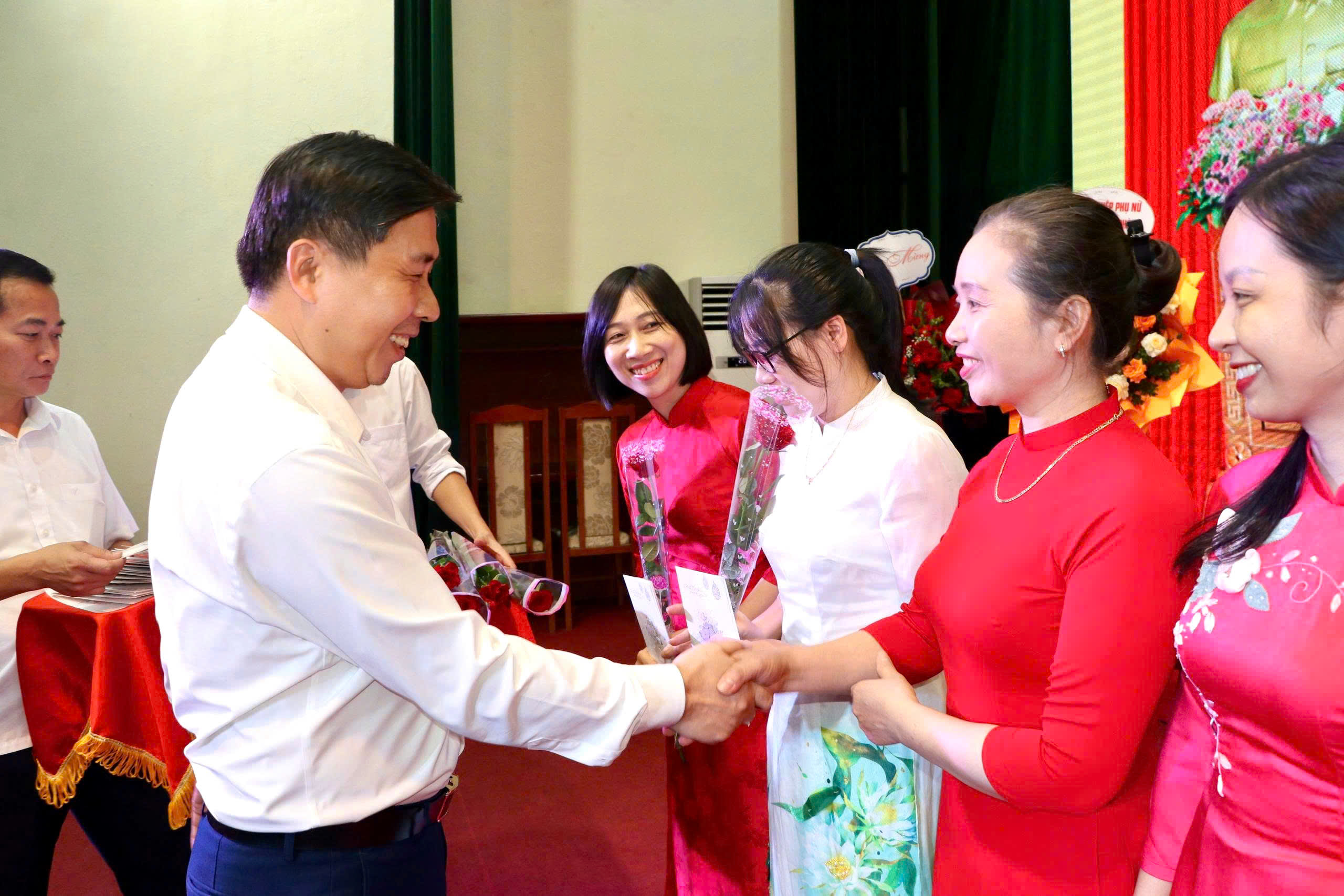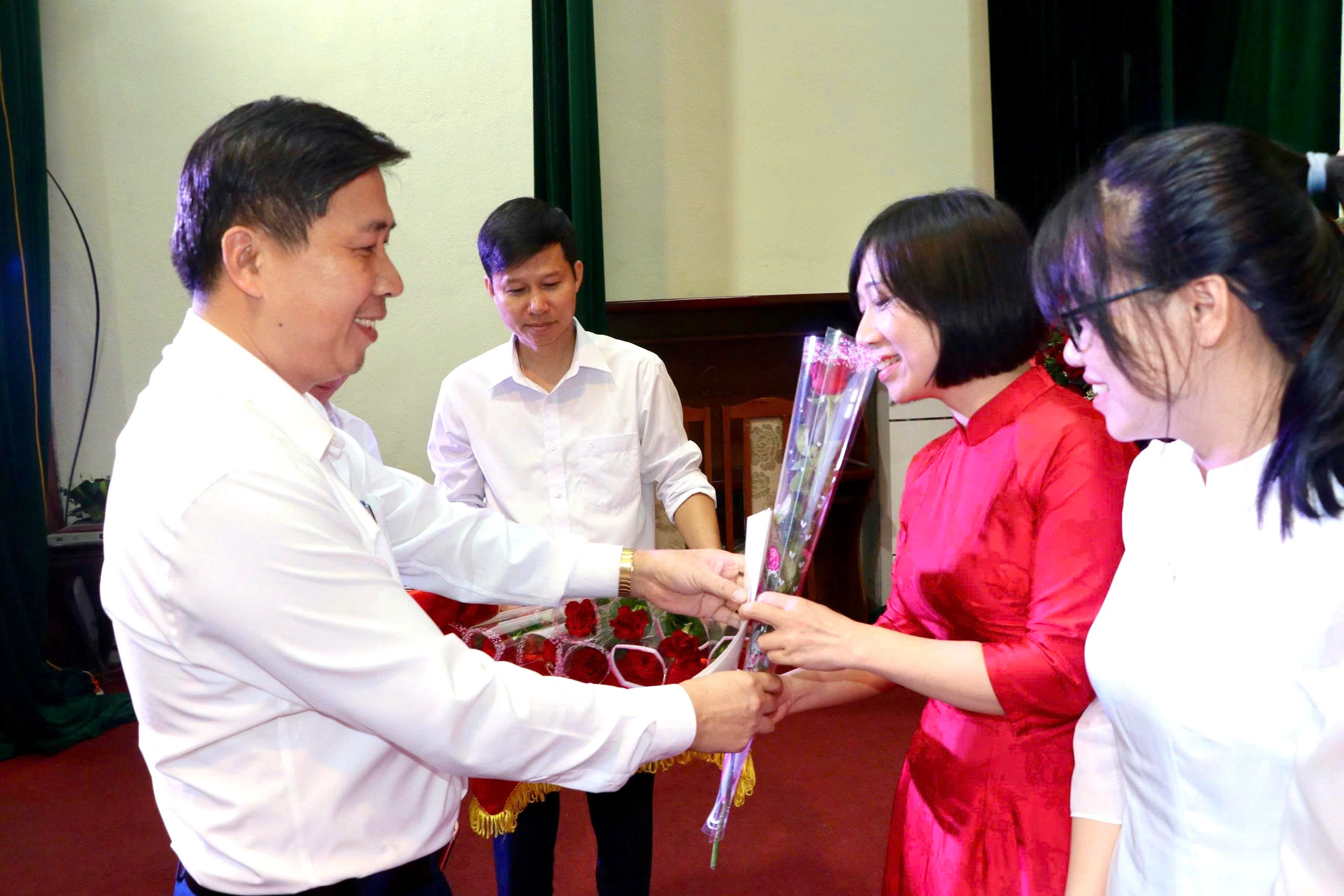 Đồng chí Phùng Văn Diện – Phó Bí thư, Chủ tịch UBND xã tặng hoa chúc mừng nữ cán bộ cơ quan Đảng, chính quyền xã nhân dịp 20/10