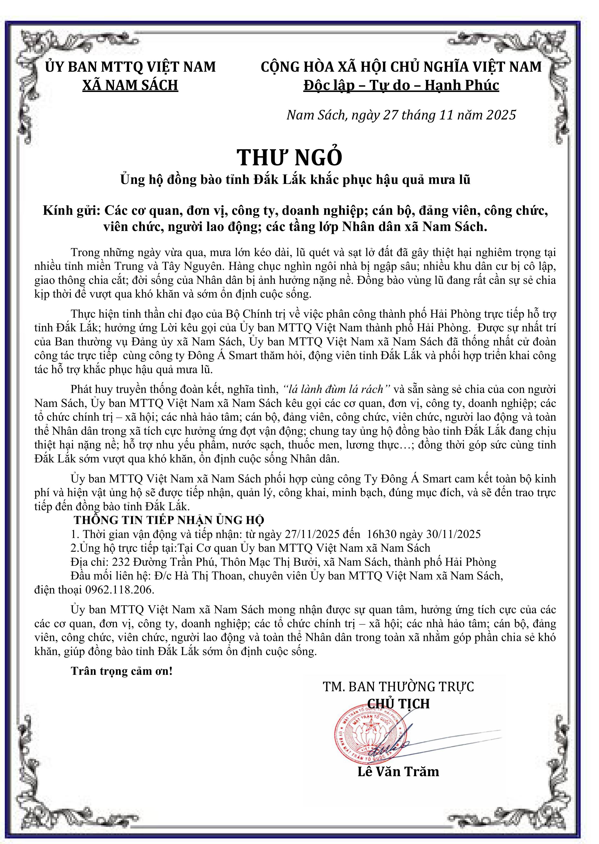 Ủy ban MTTQ Việt Nam xã Nam Sách cam kết toàn bộ nguồn hỗ trợ sẽ được tiếp nhận, quản lý công khai, minh bạch và chuyển trực tiếp đến đồng bào tỉnh Đắk Lắk sớm nhất.
