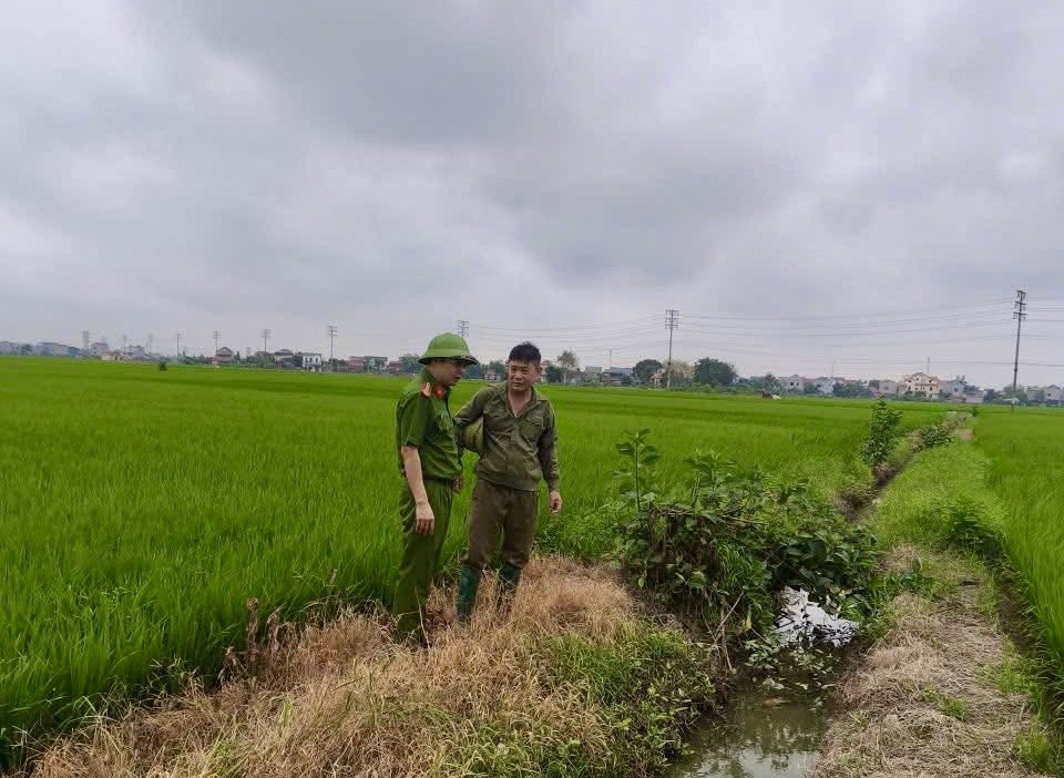 Công an xã Nam Sách kiểm tra, nhắc nhở người dân về nguy cơ mất an toàn khi giăng điện bẫy chuột ngoài đồng.