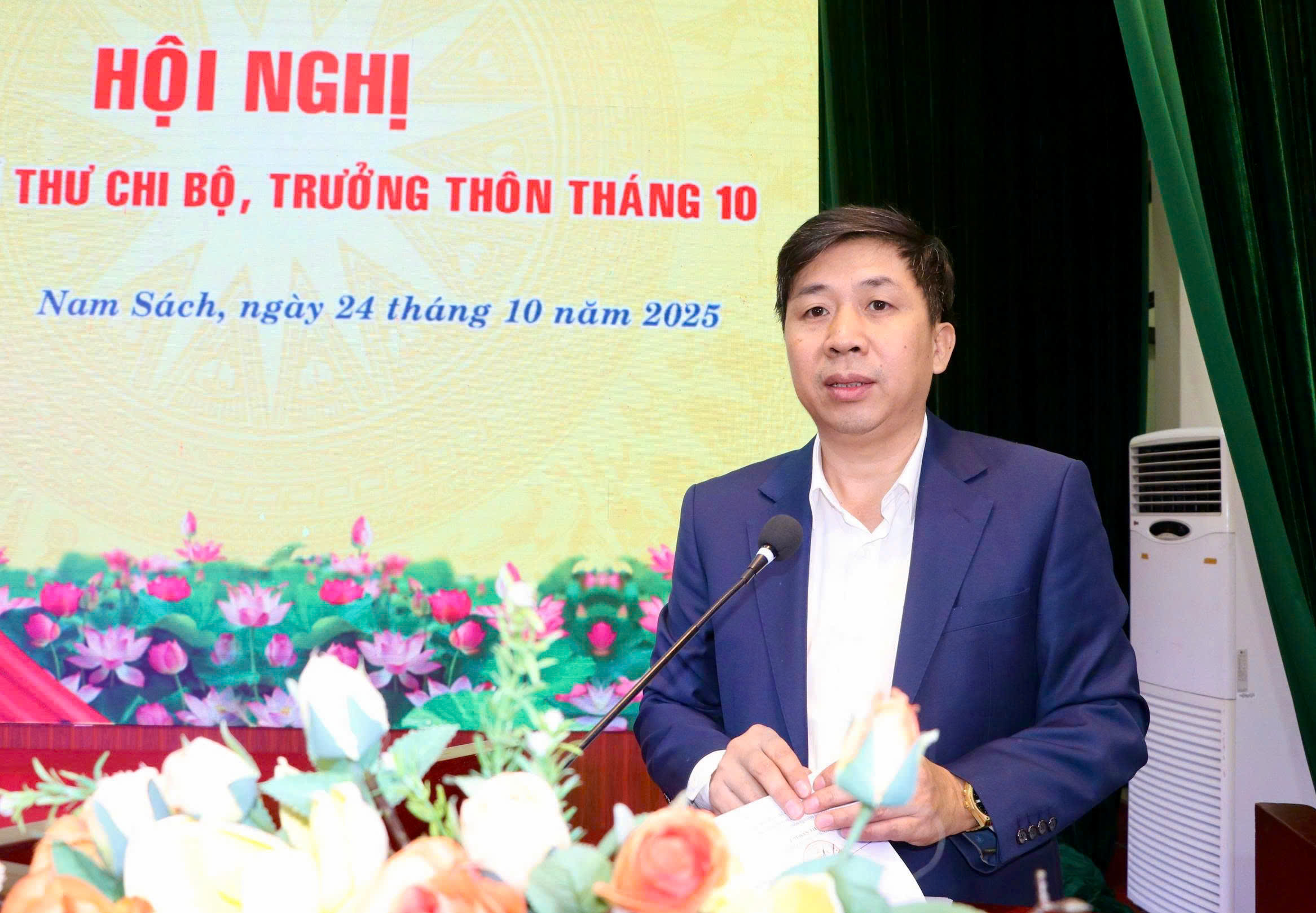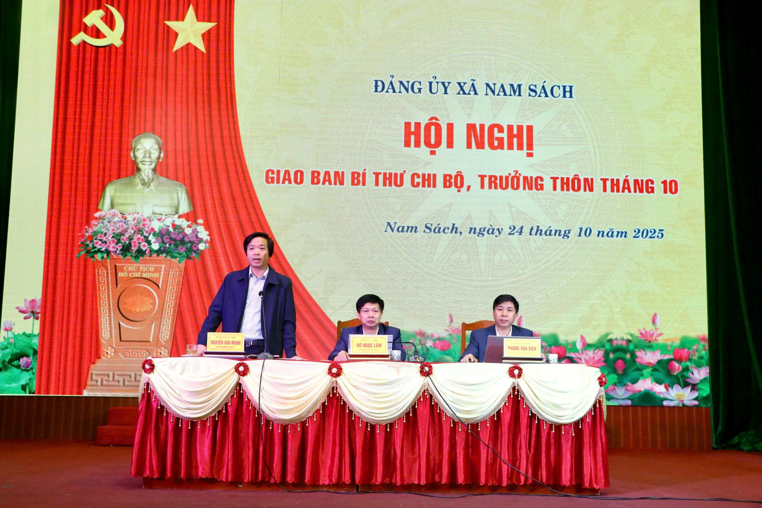Sáng ngày 24/10/2025, tại Trung tâm Văn hóa xã, Đảng ủy xã Nam Sách tổ chức Hội nghị giao ban Bí thư chi bộ, Trưởng thôn tháng 10 nhằm đánh giá kết quả công tác lãnh đạo, chỉ đạo trong tháng 10 và đề ra phương hướng, nhiệm vụ trọng tâm tháng 11/2025. Các đồng chí Hồ Ngọc Lâm – Bí thư Đảng ủy, Chủ tịch HĐND xã; Nguyễn Văn Mạnh – Phó Bí thư Thường trực Đảng ủy xã; Phùng Văn Diện – Phó Bí thư Đảng ủy, Chủ tịch UBND xã đồng chủ trì.