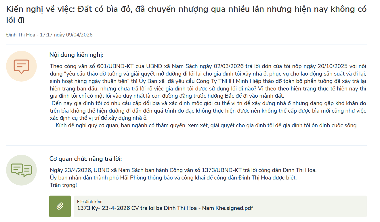 Công khai kết quả xử lý phản ánh, kiến nghị PAKN.20260409.0736