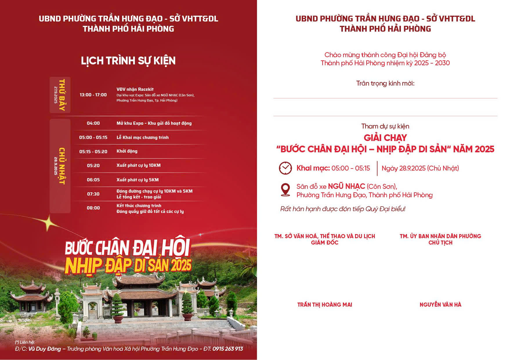 Nhằm chào mừng thành công Đại hội đại biểu Đảng bộ thành phố Hải Phòng nhiệm kỳ 2025 – 2030, sáng 28/9, Sở Văn hóa, Thể thao và Du lịch phối hợp với Đảng ủy, HĐND, UBND phường Trần Hưng Đạo, TP Hải Phòng sẽ tổ chức Giải chạy “Bước chân Đại hội – Nhịp đập Di sản 2025” tại khu di tích Côn Sơn – Kiếp Bạc.