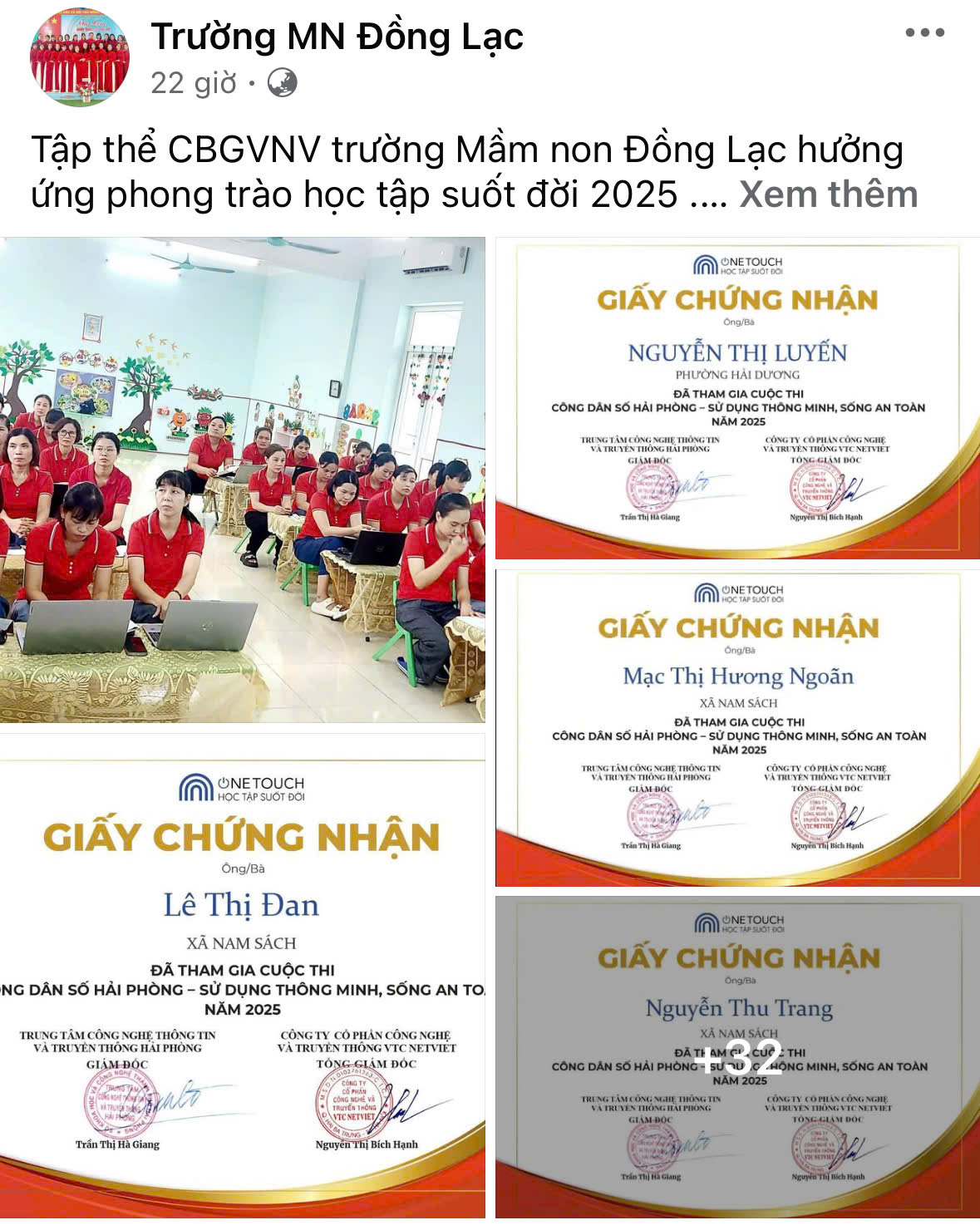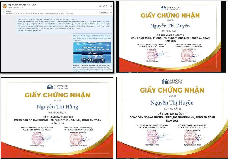 Đáng chú ý, nhiều trường đã chỉ đạo giáo viên chủ nhiệm linh hoạt tuyên truyền tới phụ huynh qua nhóm Zalo lớp bằng thông điệp ngắn gọn, dễ hiểu, kèm hướng dẫn thao tác dự thi. Nhờ đó, thông tin nhanh chóng lan tỏa đến từng gia đình; nhiều phụ huynh tích cực tham gia, gửi kết quả về nhóm lớp, tạo hiệu ứng thi đua sôi nổi, góp phần lan tỏa kỹ năng sử dụng dịch vụ số an toàn, văn minh trong đời sống. Nổi bật trong công tác vận động phụ huynh là Trường Mầm non Nam Sách và Trường Mầm non Đồng Lạc.